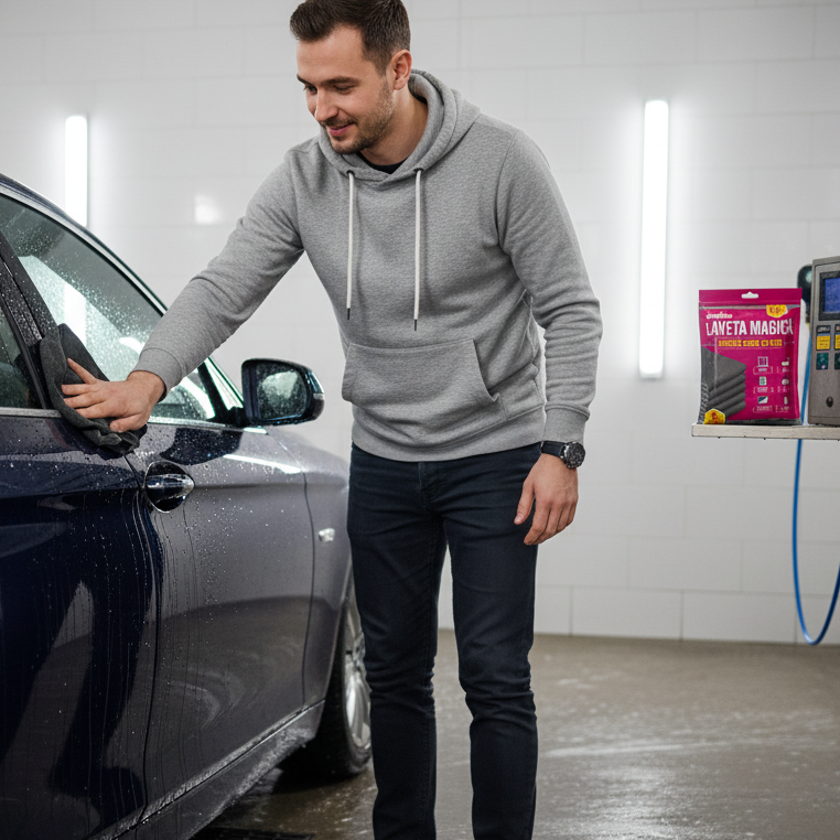 Dupa clatire, trec o singura data cu "Laveta Magica" peste caroserie si geamuri si nu mai apar pete de apa. Se stoarce usor, nu lasa scame pe vopsea si e perfecta si pentru oglinzi si bord. Am una permanent in portbagaj.